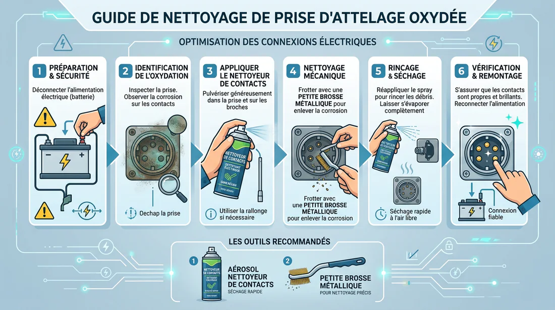 Batterie débranchée, retirez le capuchon de la prise (s'il y en a un) et inspectez les broches. Si vous voyez du vert, du blanc ou du marron sur les contacts, c'est votre coupable. Brossez chaque broche individuellement avec la brosse métallique, puis aspergez généreusement de nettoyant contact. Laissez sécher 5 minutes.